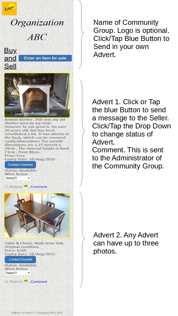 Format type Goods for Sale: This is aimed at small community organizations like Church Groups, Sports Clubs, Hobby Groups etc. This Web Page enables your organization to publish a Web Page displaying what your members have for Sale or Free, to its members. It is a secure Web Page in that you can only get to it via a Hotlink. That Hotlink could be supplied to all your members via Email or put up on your Web Site.Currently the maximum number of Adverts that can be handled at any onetime is 30. The Sale Prices should be either Free or a maximum price of $99 . The price is considered to be a Token amount. It is envisage that the Goods are put up for Sale because they are no longer needed and may be of use for somebody else. Its all about helping others. The Hotlink can be found at Step 4 when generating your Web Page. The Web Page you create has no time limit. Only the Adverts within the Web Page have a time limit. The Hotlink remains the same unless you delete the Web Page. You can always create a new Web Page if necessary.